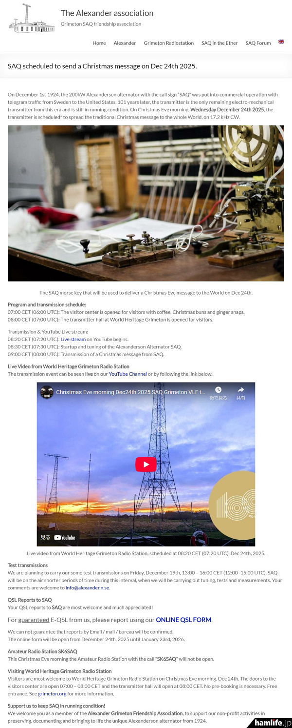 ユネスコの世界遺産に登録されているスウェーデンの「グリムトン長波海岸局」、通称「ヴァールベリの無線局」から、今年も全世界に向けて、クリスマス・イブのメッセージ送信(電信)が超長波の17.2kHz(出力は200kW)で行われる。予定では、日本時間の2025年12月24日(水)16時30分から装置の起動とチューニングを開始。そして、30分後の17時からメッセージが送信される。直接、遠く離れた日本で信号を聞くことは難しいが、同日16時20分から始まるYouTubeでのライブ配信、または、オランダの「Universiteit Twente(トゥウェンテ大学)」が開設している「SDRラジオ(WEBラジオ)」を利用すれば、インターネット経由で日本からでもクリスマスメッセージが聞けるだろう。なお、同所にあるアマチュア無線局「SK6SAQ」からの運用は、今回行われないようだ。