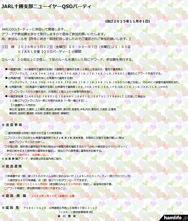 ログ提出の締め切りは2026年1月30日(金)まで(必着)。申請書は交信リストと180円切手(参加賞のみは110円切手)同封し、返信用封筒不要。アワード申請か参加賞申請かを封筒に朱書すること。詳しくは、下記の関連リンクから「JARL十勝支部ニューイヤーQSOパーティー規約」で確認してほしい。