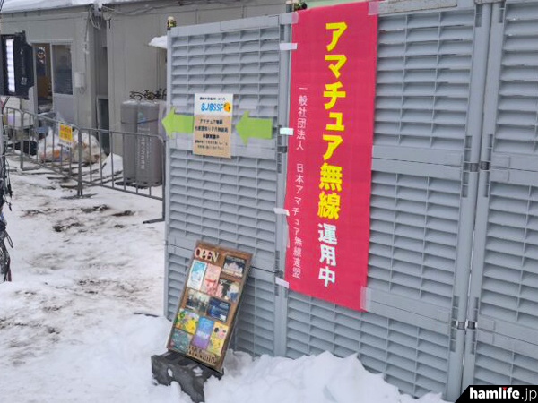 「8J8SSF大通会場公開運用はトラブルなく順調な滑り出しです。ただ、今年は飲食のプレハブが多くなりまして、従来のような “大雪像を見て、振り返れば無線プレハブ” とはいかなくなり、ちょっと見つけづらい状態になっていますが、看板増設でなんとかしのいでいます」