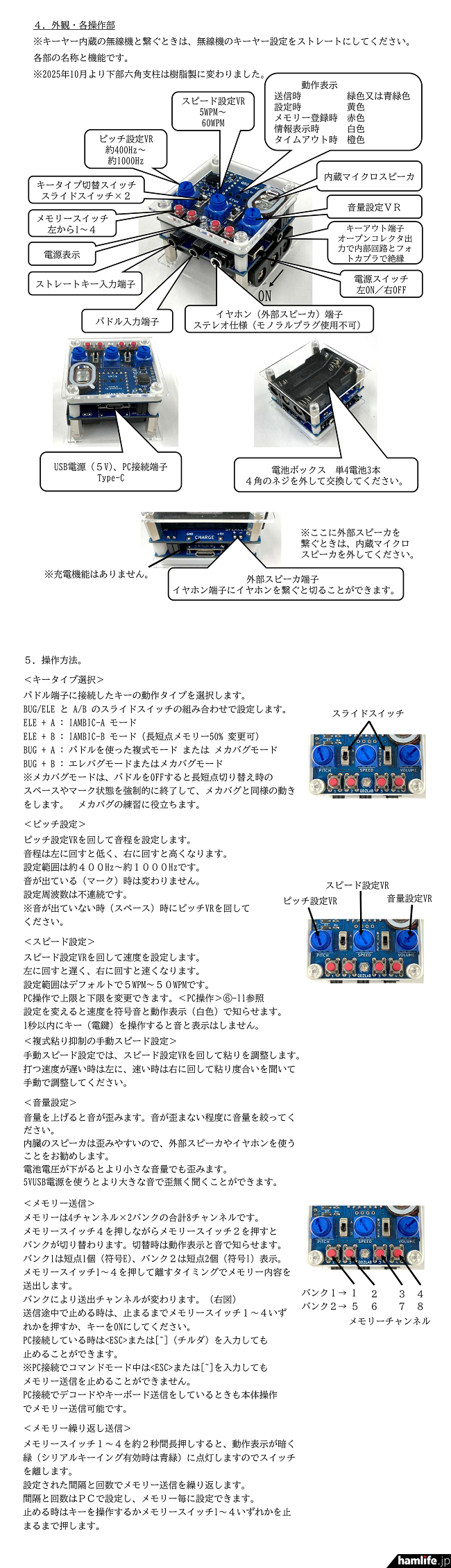 「ストレートキーとパドルを同時に接続できます。エレキー、エレバグだけでなく、複式やメカバグ動作でラグチューを楽しくします。複式にはネバリ抑制機能も搭載しています。