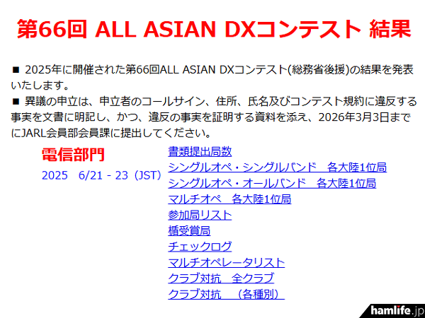 2025年6月21日(土)から23日(月)まで開催した「第66回 ALL ASIAN DXコンテスト(電信部門)」の結果発表が、一般社団法人 日本アマチュア無線連盟(JARL)から2026年2月12日にあった。従来は、9月開催の「電話部門」とともに、その結果が翌年の2月下旬ごろ一緒に発表していたが、2022年開催の「第63回」と、2023年開催の「第64回」のときは、「電信部門」の結果のみ1月に先行で発表され、3月に「電話部門」の結果を発表していた。しかし再び、2024年開催の「第65回」は「電信部門」と「電話部門」を同時発表。そして今回はまた「電信部門」を先行発表する形になっている。