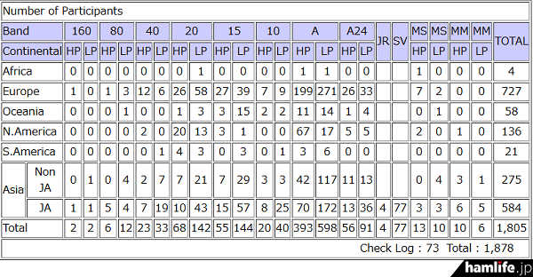 2025年6月21日(土)から23日(月)までの48時間開催された「電信部門」の有効ログ提出局数は、アフリカ4局、ヨーロッパ727局、オセアニア58局、北アメリカ136局、南アメリカ21局、アジア(JA以外)275局、JA(国内)584局の合計1,805局、Check Log73局で総合計は1,878局(有効ログ提出局数>第65回は1,764局、第64回は1,717局、第63回は1,726局、第62回は1,656局、第61回は1,897局、第60回は1,489局、第59回は1,395局、第58回は1,511局、第57回は1,681局、第56回は1,823局、第55回は1,398局)となっている。