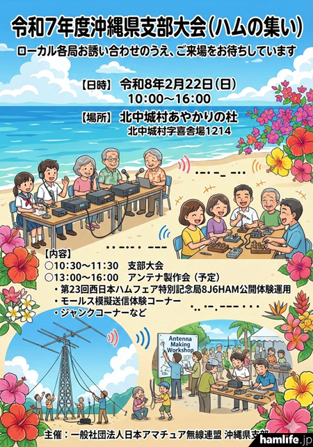 一般社団法人 日本アマチュア無線連盟(JARL)沖縄県支部は、2026年2月22日(日)に中頭郡北中城村のあやかりの杜で「令和7年度沖縄県支部大会(ハムの集い)」を開催する。詳細は同支部のWebサイトで下記のように発表されている。