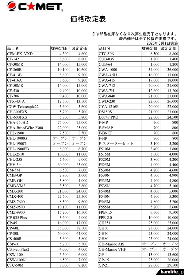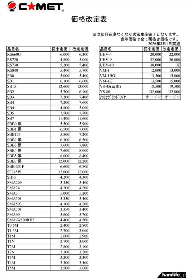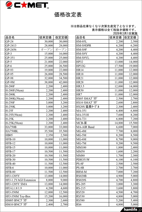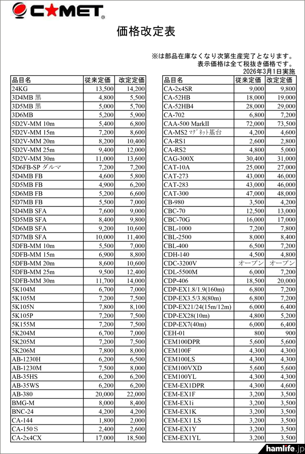 アンテナメーカーのコメット株式会社は2026年2月19日、アンテナ(固定、車載、ハンディ、ポータブル用)、同軸ケーブル、バラン、デュプレクサー、アンテナチューナーなど、同社製品の価格を3月1日から改定することを同社公式サイトで告知し、PDF版の価格改訂表を掲載した。