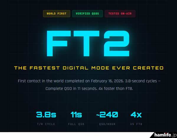 イタリアのIU8LMC局が開発したデジタル文字通信の「FT2」は、FT8やFT4と同じコーデックを使いながら、1回(片道)の送信サイクルがわずか約3.8秒(FT8よりも約4倍速い)、1局との交信に要する時間は最速の場合で約11秒というスピード感が特徴のモードだ(ただしデコード感度はFT8よりも約10dB悪く、1局あたりの帯域幅はFT8よりも3倍広い)。2月中旬に一般公開が始まり、早くも多くの局がテスト運用を行っている。