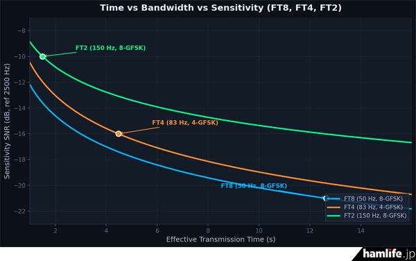 FT2とFT8、FT4の帯域幅とデコード感度比較(FT2サイトより)