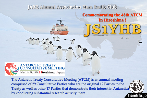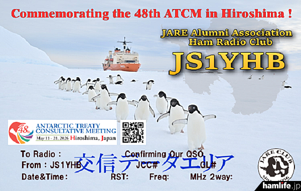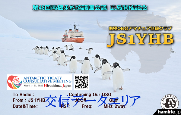 南極越冬経験者や、南極昭和基地のJARL南極局「8J1RL」の運用者などがメンバーの「南極OB会アマチュア無線クラブ(JS1YHB)」は、「広島に南極がやってくる!」をキャッチコピーに、2026年5月11日から5月21日まで32年ぶりに日本(広島)で行われる「南極条約協議国会議(ATCM)」に合わせて、「開催意義を広く周知し、南極観測への関心を高めていただくための活動を展開するため」として、公式ロゴを配した「特別仕様のQSLカード」を3タイプ(紙ベース、eQSL、hQSL)作成し2月26日(水)から発行を開始した(終了期間未定)。