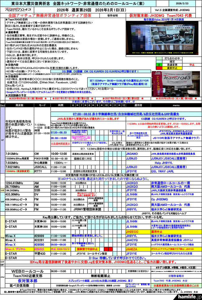 2011年3月11日に発生した東日本大震災を機に、非常通信のためのロールコールを自発的に行う有志が集まって発足した「Team7043」では、毎年3月と9月の年2回、全国規模の非常通信訓練を行っているが、通算29回目(今年2回目)となる訓練が206年3月1日(日)に同グループにより、7MHz帯、28MHz帯、144MHz帯、430MHZ帯、1200MHz帯で行われる。訓練はロールコール形式で、交信はキー局と「RS(T)+QTH(JCC/JCG)+OP名+(GL任意)」のリポート交換。QSLカードはJARL経由(1Way)で発行する。D-STARやWIRES-Xでの交信も実施される。