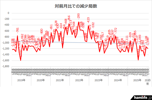 2026年3月2日、総務省は2026年1月末のアマチュア無線局数を公表した。それによると前回の2025年12月末のデータから1か月間で1,189局減少して332,120局となった。2025年6月末から、アマチュア局数は6か月連続で前月比「▲1,000局以上」のペースで減り続けている。
