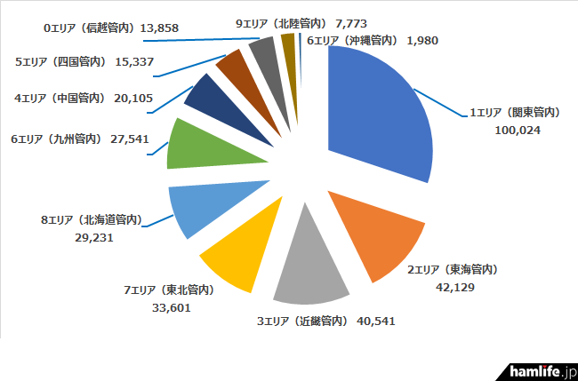 アマチュア局登録の多いエリア順に並べると、1エリア(関東管内)は10万局以上の登録があるが、2番目は2エリア(東海管内)で3位が3エリア(近畿管内)、そして4位には7エリア(東北管内)、5位は8エリア(北海道管内)、6位は6エリア(九州管内)と続く
