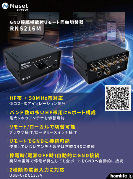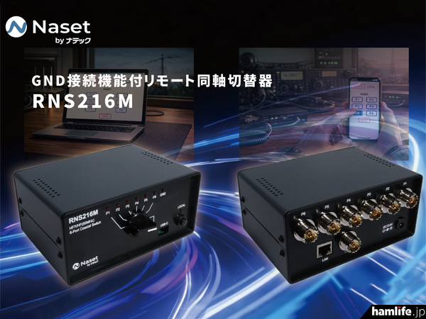 アンテナメーカーの株式会社ナテックは、このほど新ブランド「Naset」を立ち上げた。その製品第一弾として、流行中のリモート運用(遠隔操作運用)に対応する “GND接続機能つきリモート同軸切替器” の「RNS216M」を2026年3月3日に発表した。LANとUSB端子を装備し、HF+50MHz帯で最大6本のアンテナを遠隔操作で切り替えでき、使用していないアンテナ端子は常時GNDに接続(雷などで停電が発生した場合も全ポートをGNDへ自動的に接続)する設計が施されているという。耐入力は150W、発売開始は2026年3月中旬~下旬頃を予定し価格はオープン。