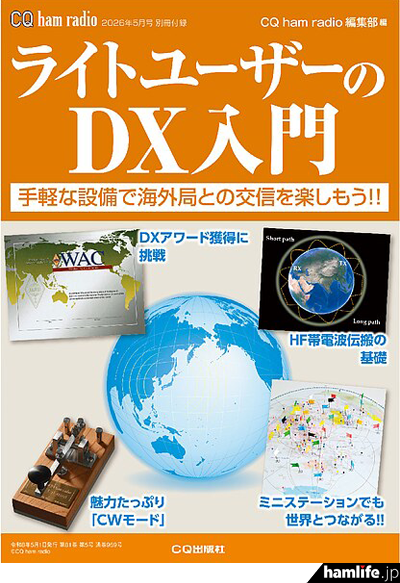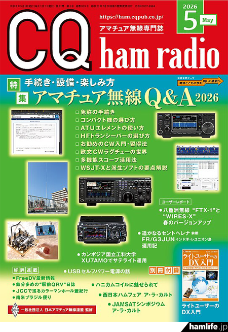 CQ出版社はアマチュア無線界で唯一の月刊誌、「CQ ham radio」の2026年5月号を4月17日(金)に発売する。同誌は1946(昭和21)年9月号の創刊で今号は通巻959号となる。特集は「~手続き・設備・楽しみ方~ アマチュア無線Q&A 2026」。さらに「速報!! 八重洲無線 “FTX-1” と “WIRES-X” 春のバージョンアップ」「ロストテクノロジーには惜しい技術 ハニカムコイルの魅力」「電流供給能力と安定性を検証する USBセルフパワー電源の話」「第23回西日本ハムフェア ア・ラ・カルト」「遥かなるセントヘレナ FR/G3JUN インド洋・レユニオン島運用記」などの記事も掲載。別冊付録「ライトユーザーのDX入門」がついて、価格は1,100円(税込)。