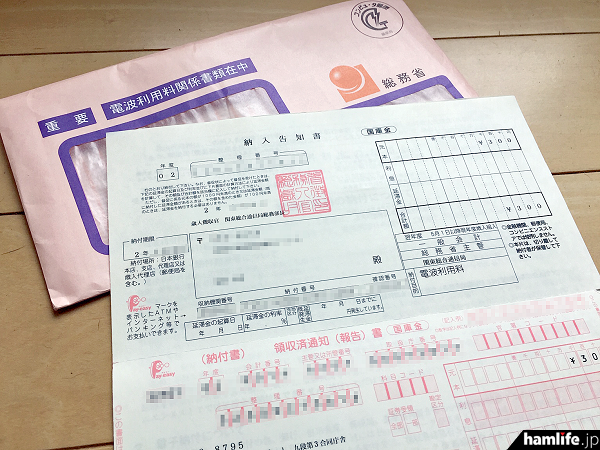 電波利用料の納入告知書の例(今回の事件とは無関係)。「良好な電波環境の構築・整備に係る費用を、電波の利用状況に応じてその受益者である無線局の免許人等に負担していただく」として、アマチュア局は1局あたり年額300円の「電波利用料」が徴収され、無線局免許を受けた総合通信局などから「納入告知書(納付書)」が送られてくる
