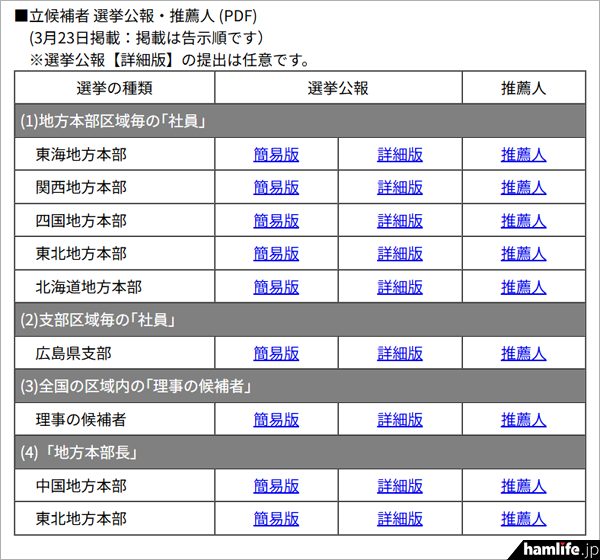 投票の参考になる、立候補者の選挙公報(全員が提出する「簡易版」と任意提出の「詳細版」がある)と推薦人名簿はJARLの令和8年通常選挙のページに掲載されている。また無投票当選が決まった立候補者についても別掲されている。