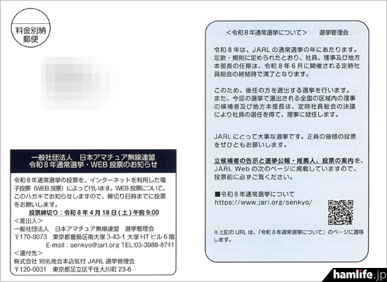 JARL選挙管理会から有権者に届いたWeb投票の案内ハガキ(圧着式)。還付先の「株式会社宛名商会本店」はJARL NEWSや会員局名録などの発送を担当している業者だ