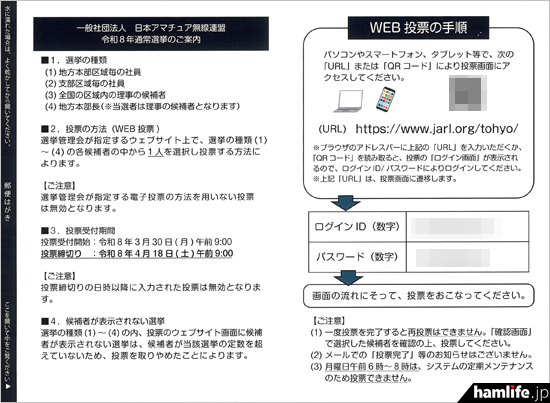 これまでJARLの通常選挙は、選挙管理会から有権者(3月7日現在の会員名簿に記載されている個人の正員)にマークシート式の投票用紙が送付され、それに記入した上で返信用封筒に入れて返送し、投票締め切り日の翌日に開票作業が行われてきたが、費用と手間がかかることから、今回から有権者にログインIDとパスワードを記載した案内ハガキを送付。専用のWebサイトにログインした上で投票を行う形式(Web投票)に改められた。