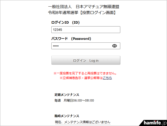 ・JARL令和8年通常選挙 投票ログイン画面(※要・ログインID/パスワード)