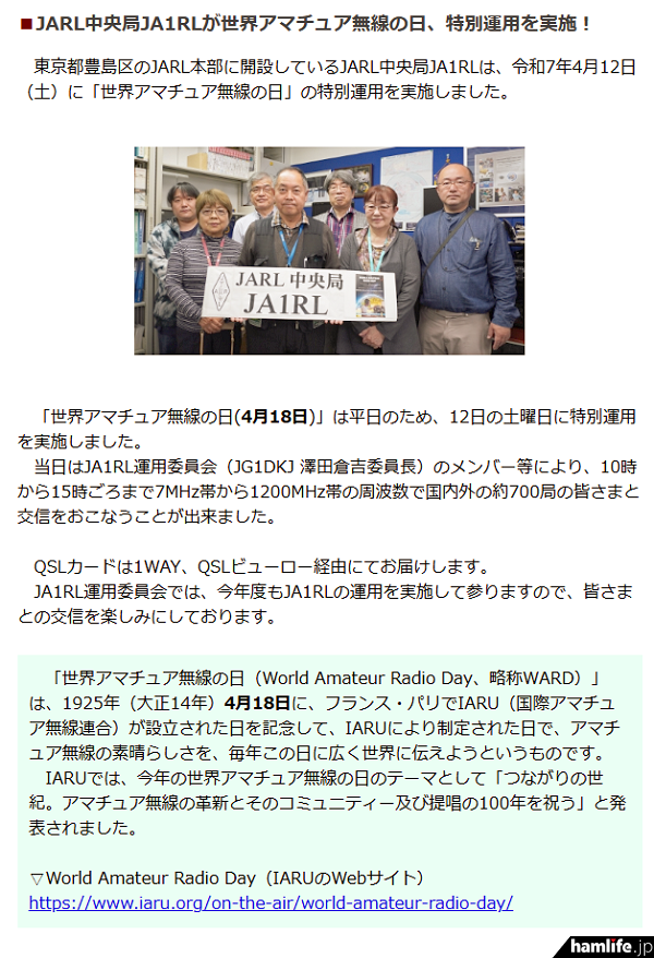 昨年(2025年)4月12日(日)に、JARL中央局「JA1RL」が東京・大塚のJARL本部から「世界アマチュア無線の日」の特別運用を各バンド・各モードで行った。今年(2026年)は4月19日(日)10時ごろから15時ごろまで特別運用を予定している。